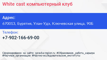 White cast, компьютерный клуб по адресу 670013, Бурятия, Улан-Удэ, Ключевская улица, 90Б в дальнейшем Организация, размещена в следующих категориях: