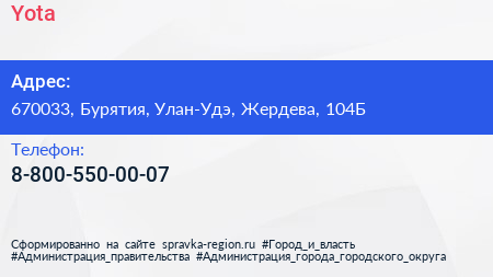 Yota по адресу 670033, Бурятия, Улан-Удэ, Жердева, 104Б в дальнейшем Организация, размещена в следующих категориях: