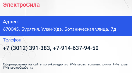 ЭлектроСила по адресу 670045, Бурятия, Улан-Удэ, Ботаническая улица, 7д в дальнейшем Организация, размещена в следующих категориях: