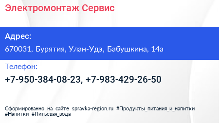 Электромонтаж Сервис по адресу 670031, Бурятия, Улан-Удэ, Бабушкина, 14а в дальнейшем Организация, размещена в следующих категориях: