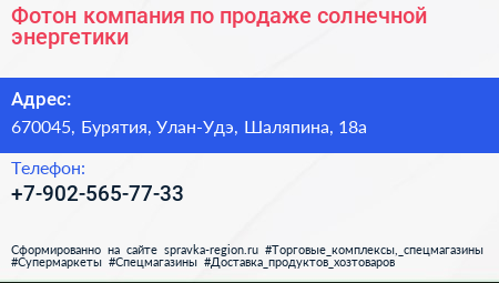 Фотон, компания по продаже солнечной энергетики по адресу 670045, Бурятия, Улан-Удэ, Шаляпина, 18а в дальнейшем Организация, размещена в следующих категориях: