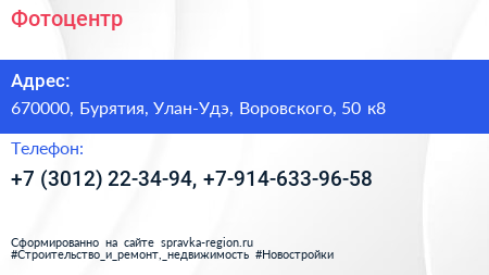 Фотоцентр по адресу 670000, Бурятия, Улан-Удэ, Воровского, 50 к8 в дальнейшем Организация, размещена в следующих категориях: