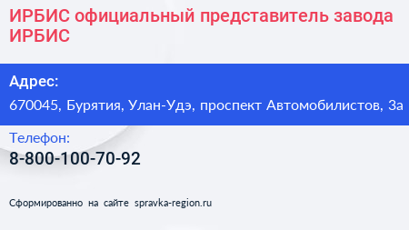 ИРБИС, официальный представитель завода ИРБИС по адресу 670045, Бурятия, Улан-Удэ, проспект Автомобилистов, 3а в дальнейшем Организация, размещена в следующих категориях: