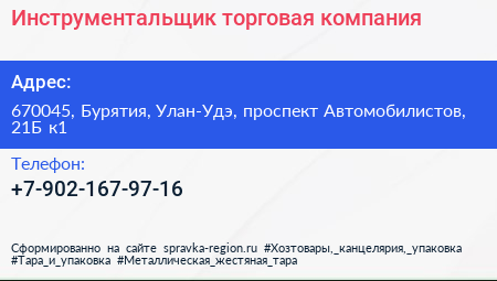 Инструментальщик, торговая компания по адресу 670045, Бурятия, Улан-Удэ, проспект Автомобилистов, 21Б к1 в дальнейшем Организация, размещена в следующих категориях: