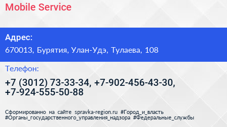 Mobile Service по адресу 670013, Бурятия, Улан-Удэ, Тулаева, 108 в дальнейшем Организация, размещена в следующих категориях: