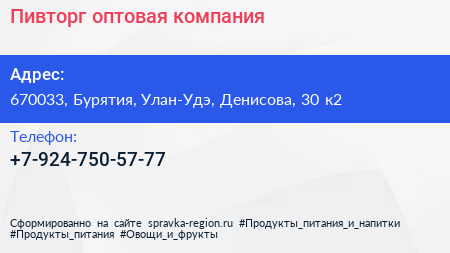 Пивторг, оптовая компания по адресу 670033, Бурятия, Улан-Удэ, Денисова, 30 к2 в дальнейшем Организация, размещена в следующих категориях:
