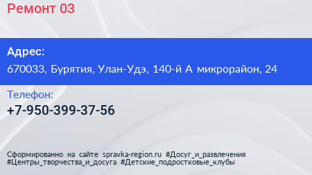 Ремонт 03 по адресу 670033, Бурятия, Улан-Удэ, 140-й А микрорайон, 24 в дальнейшем Организация, размещена в следующих категориях: