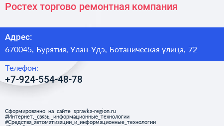 Ростех, торгово-ремонтная компания по адресу 670045, Бурятия, Улан-Удэ, Ботаническая улица, 72 в дальнейшем Организация, размещена в следующих категориях: