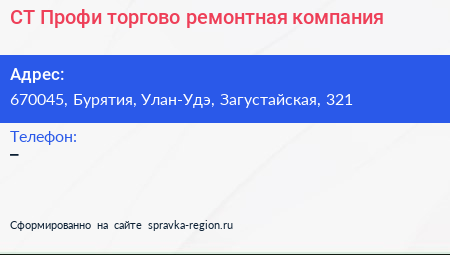 СТ-Профи, торгово-ремонтная компания по адресу 670045, Бурятия, Улан-Удэ, Загустайская, 321 в дальнейшем Организация, размещена в следующих категориях: