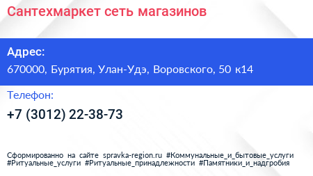 Сантехмаркет, сеть магазинов по адресу 670000, Бурятия, Улан-Удэ, Воровского, 50 к14 в дальнейшем Организация, размещена в следующих категориях: