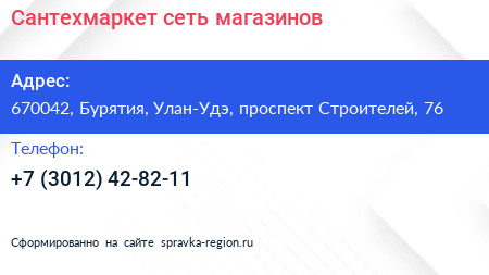 Сантехмаркет, сеть магазинов по адресу 670042, Бурятия, Улан-Удэ, проспект Строителей, 76 в дальнейшем Организация, размещена в следующих категориях: