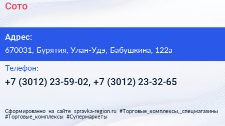 Сото по адресу 670031, Бурятия, Улан-Удэ, Бабушкина, 122а в дальнейшем Организация, размещена в следующих категориях: