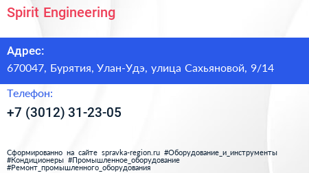 Spirit Engineering по адресу 670047, Бурятия, Улан-Удэ, улица Сахьяновой, 9/14 в дальнейшем Организация, размещена в следующих категориях: