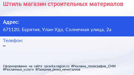 Штиль, магазин строительных материалов по адресу 671120, Бурятия, Улан-Удэ, Солнечная улица, 2а в дальнейшем Организация, размещена в следующих категориях: