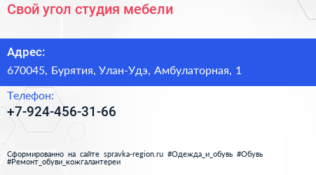 Свой угол, студия мебели по адресу 670045, Бурятия, Улан-Удэ, Амбулаторная, 1 в дальнейшем Организация, размещена в следующих категориях: