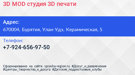 3D MOD, студия 3D-печати по адресу 670004, Бурятия, Улан-Удэ, Керамическая, 5 в дальнейшем Организация, размещена в следующих категориях: