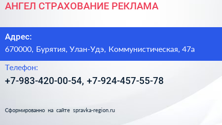 АНГЕЛ СТРАХОВАНИЕ РЕКЛАМА по адресу 670000, Бурятия, Улан-Удэ, Коммунистическая, 47а в дальнейшем Организация, размещена в следующих категориях: