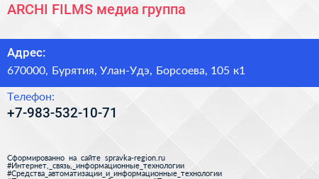 ARCHI FILMS, медиа-группа по адресу 670000, Бурятия, Улан-Удэ, Борсоева, 105 к1 в дальнейшем Организация, размещена в следующих категориях: