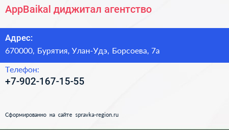 AppBaikal, диджитал-агентство по адресу 670000, Бурятия, Улан-Удэ, Борсоева, 7а в дальнейшем Организация, размещена в следующих категориях: