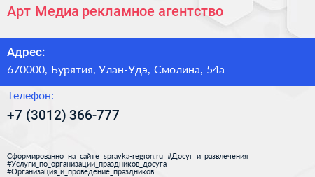Арт-Медиа, рекламное агентство по адресу 670000, Бурятия, Улан-Удэ, Смолина, 54а в дальнейшем Организация, размещена в следующих категориях: