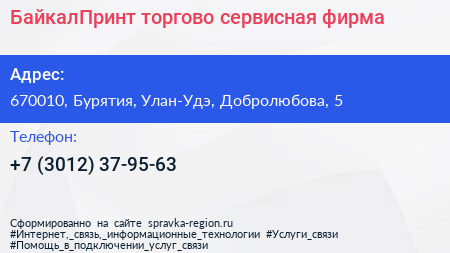 БайкалПринт, торгово-сервисная фирма по адресу 670010, Бурятия, Улан-Удэ, Добролюбова, 5 в дальнейшем Организация, размещена в следующих категориях: