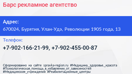 Барс, рекламное агентство по адресу 670024, Бурятия, Улан-Удэ, Революции 1905 года, 13 в дальнейшем Организация, размещена в следующих категориях: