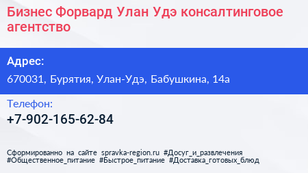 Бизнес Форвард Улан-Удэ, консалтинговое агентство по адресу 670031, Бурятия, Улан-Удэ, Бабушкина, 14а в дальнейшем Организация, размещена в следующих категориях: