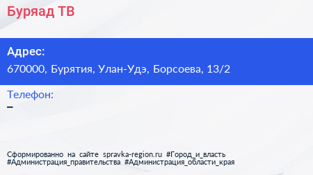 Буряад ТВ по адресу 670000, Бурятия, Улан-Удэ, Борсоева, 13/2 в дальнейшем Организация, размещена в следующих категориях:
