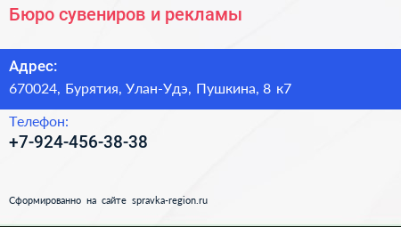 Бюро сувениров и рекламы по адресу 670024, Бурятия, Улан-Удэ, Пушкина, 8 к7 в дальнейшем Организация, размещена в следующих категориях: