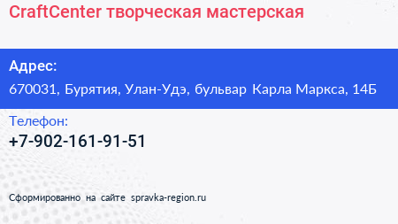 CraftCenter, творческая мастерская по адресу 670031, Бурятия, Улан-Удэ, бульвар Карла Маркса, 14Б в дальнейшем Организация, размещена в следующих категориях: