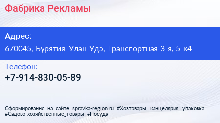 Фабрика Рекламы по адресу 670045, Бурятия, Улан-Удэ, Транспортная 3-я, 5 к4 в дальнейшем Организация, размещена в следующих категориях: