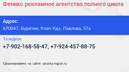 Феникс, рекламное агентство полного цикла по адресу 670047, Бурятия, Улан-Удэ, Павлова, 57а в дальнейшем Организация, размещена в следующих категориях: