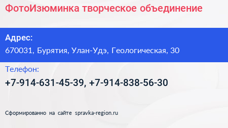 ФотоИзюминка, творческое объединение по адресу 670031, Бурятия, Улан-Удэ, Геологическая, 30 в дальнейшем Организация, размещена в следующих категориях: