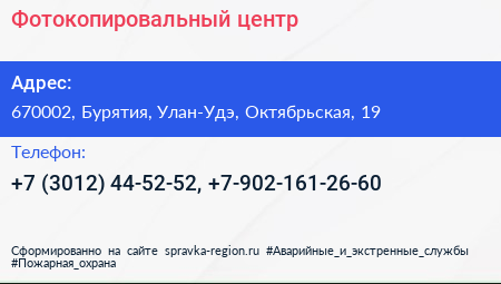 Фотокопировальный центр по адресу 670002, Бурятия, Улан-Удэ, Октябрьская, 19 в дальнейшем Организация, размещена в следующих категориях: