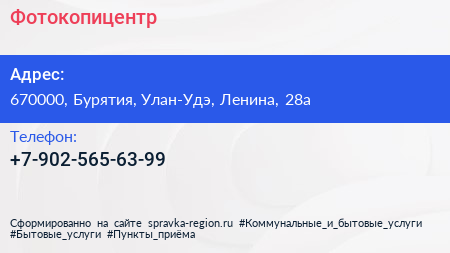 Фотокопицентр по адресу 670000, Бурятия, Улан-Удэ, Ленина, 28а в дальнейшем Организация, размещена в следующих категориях: