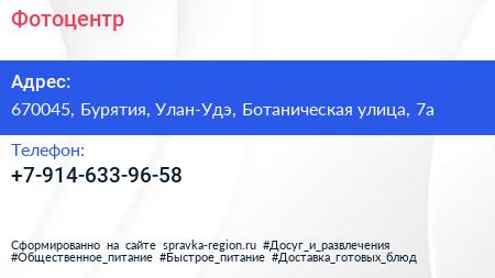 Фотоцентр по адресу 670045, Бурятия, Улан-Удэ, Ботаническая улица, 7а в дальнейшем Организация, размещена в следующих категориях: