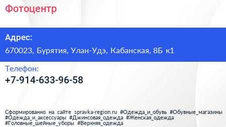 Фотоцентр по адресу 670023, Бурятия, Улан-Удэ, Кабанская, 8Б к1 в дальнейшем Организация, размещена в следующих категориях: