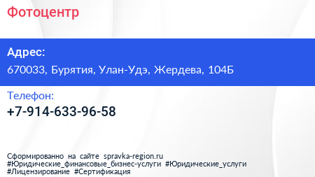 Фотоцентр по адресу 670033, Бурятия, Улан-Удэ, Жердева, 104Б в дальнейшем Организация, размещена в следующих категориях: