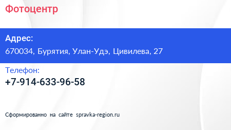 Фотоцентр по адресу 670034, Бурятия, Улан-Удэ, Цивилева, 27 в дальнейшем Организация, размещена в следующих категориях: