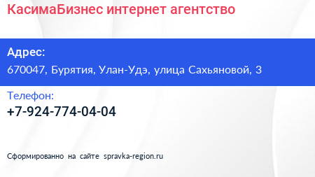 КасимаБизнес, интернет-агентство по адресу 670047, Бурятия, Улан-Удэ, улица Сахьяновой, 3 в дальнейшем Организация, размещена в следующих категориях: