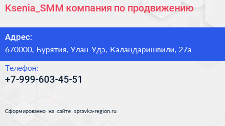 Ksenia_SMM, компания по продвижению по адресу 670000, Бурятия, Улан-Удэ, Каландаришвили, 27а в дальнейшем Организация, размещена в следующих категориях: