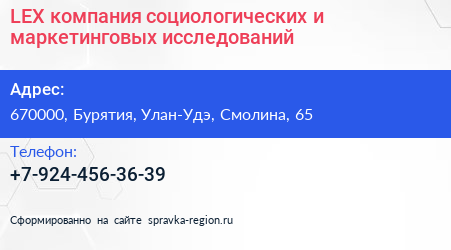 LEX, компания социологических и маркетинговых исследований по адресу 670000, Бурятия, Улан-Удэ, Смолина, 65 в дальнейшем Организация, размещена в следующих категориях: