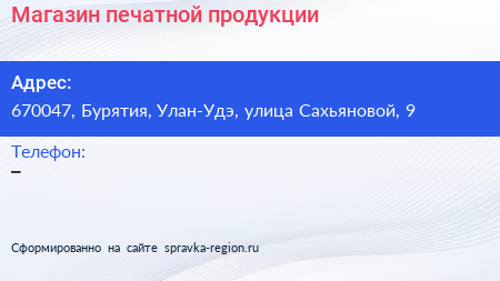 Магазин печатной продукции по адресу 670047, Бурятия, Улан-Удэ, улица Сахьяновой, 9 в дальнейшем Организация, размещена в следующих категориях: