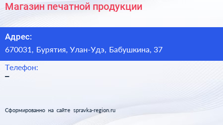 Магазин печатной продукции по адресу 670031, Бурятия, Улан-Удэ, Бабушкина, 37 в дальнейшем Организация, размещена в следующих категориях: