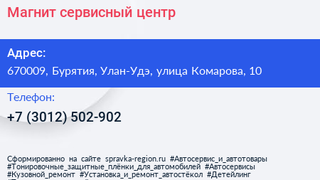 Магнит, сервисный центр по адресу 670009, Бурятия, Улан-Удэ, улица Комарова, 10 в дальнейшем Организация, размещена в следующих категориях: