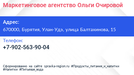 Маркетинговое агентство Ольги Очировой по адресу 670000, Бурятия, Улан-Удэ, улица Балтахинова, 15 в дальнейшем Организация, размещена в следующих категориях: