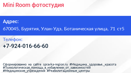 Mini Room, фотостудия по адресу 670045, Бурятия, Улан-Удэ, Ботаническая улица, 71 ст5 в дальнейшем Организация, размещена в следующих категориях: