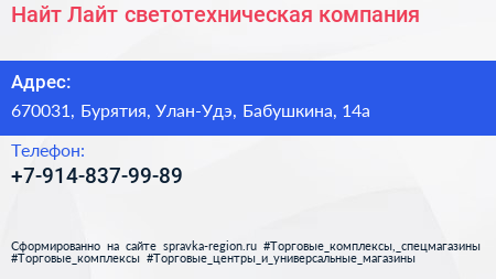 Найт Лайт, светотехническая компания по адресу 670031, Бурятия, Улан-Удэ, Бабушкина, 14а в дальнейшем Организация, размещена в следующих категориях: