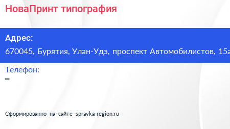 НоваПринт, типография по адресу 670045, Бурятия, Улан-Удэ, проспект Автомобилистов, 15а в дальнейшем Организация, размещена в следующих категориях: