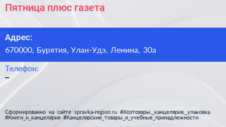 Пятница плюс, газета по адресу 670000, Бурятия, Улан-Удэ, Ленина, 30а в дальнейшем Организация, размещена в следующих категориях: